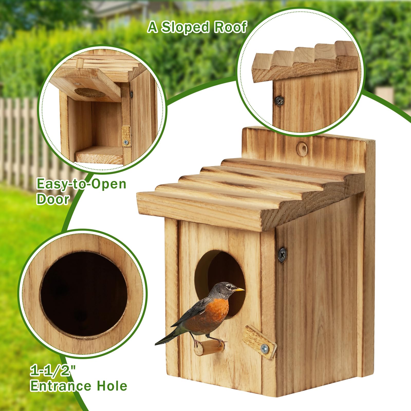 • The front of the wood bird house is set with an easy-to-open door,which allows us to quickly clean and recreate the birdhouse comfort.