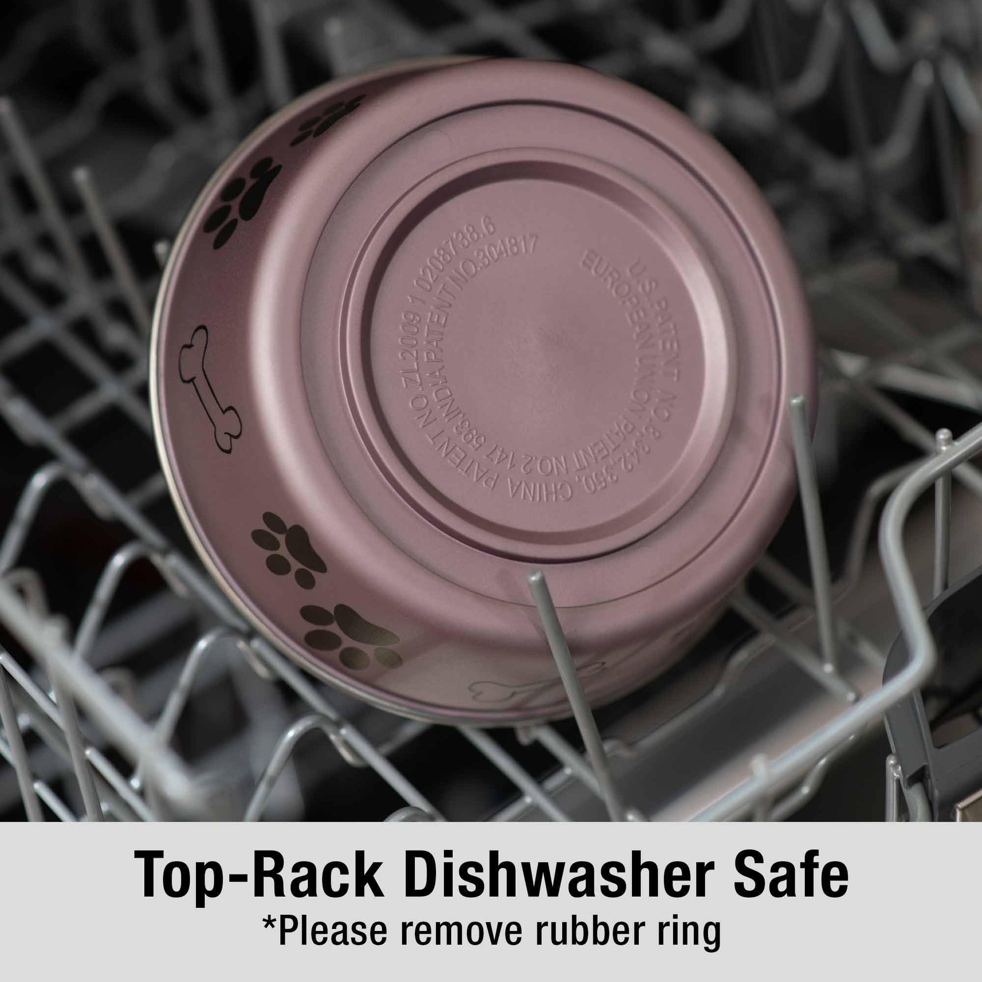 Details: This extra large grape purple stainless steel dog food and water bowl has a no-tip, no-skid design that prevents spills, making a Bella Bowl the perfect dish for your furry friend. These bowls are designed to be both functional and stylish. Whether you use it for dry or canned food or water, both you and your pet will enjoy the design and function of these bowls. Your pets mean the world to you, which is why these bowls are of the highest quality. They feature a revolutionary, patented and award-winning design. No matter which size or color option you choose, you'll bring the bestselling bowl in the pet industry into your home. Since your dog bowls likely sit out between meals, ensure they work well with your decor. Available in an array of sophisticated shades, Loving Pets Bella Bowls can complement any aesthetic with an expanding range of metallic colors. The paw print adds a decorative element and finishing touch, making these bowls just what you're looking for. Along with offering a stylish appearance, these bowls provide exceptional durability. They are built to last with an interior made out of stainless steel and an attractive polished poly-resin exterior. Each Loving Pets Bella Bowl features a removable soy-based rubber ring. If your dog has a habit of nosing their food or water bowl around, this rubber base will help keep the bowl in place instead of sliding their meal all around your home. The no-skid dog bowl design also helps prevent spills and noise during mealtimes. These vet-recommended stainless steel bowls are also dishwasher safe, making it easier than ever to keep your pet's food or water bowls clean and hygienic. The design doesn't hold odors and is rust-resistant, making it an excellent alternative to plastic. Remove the rubber base and toss the bowl in the dishwasher, reducing your daily cleanup time.