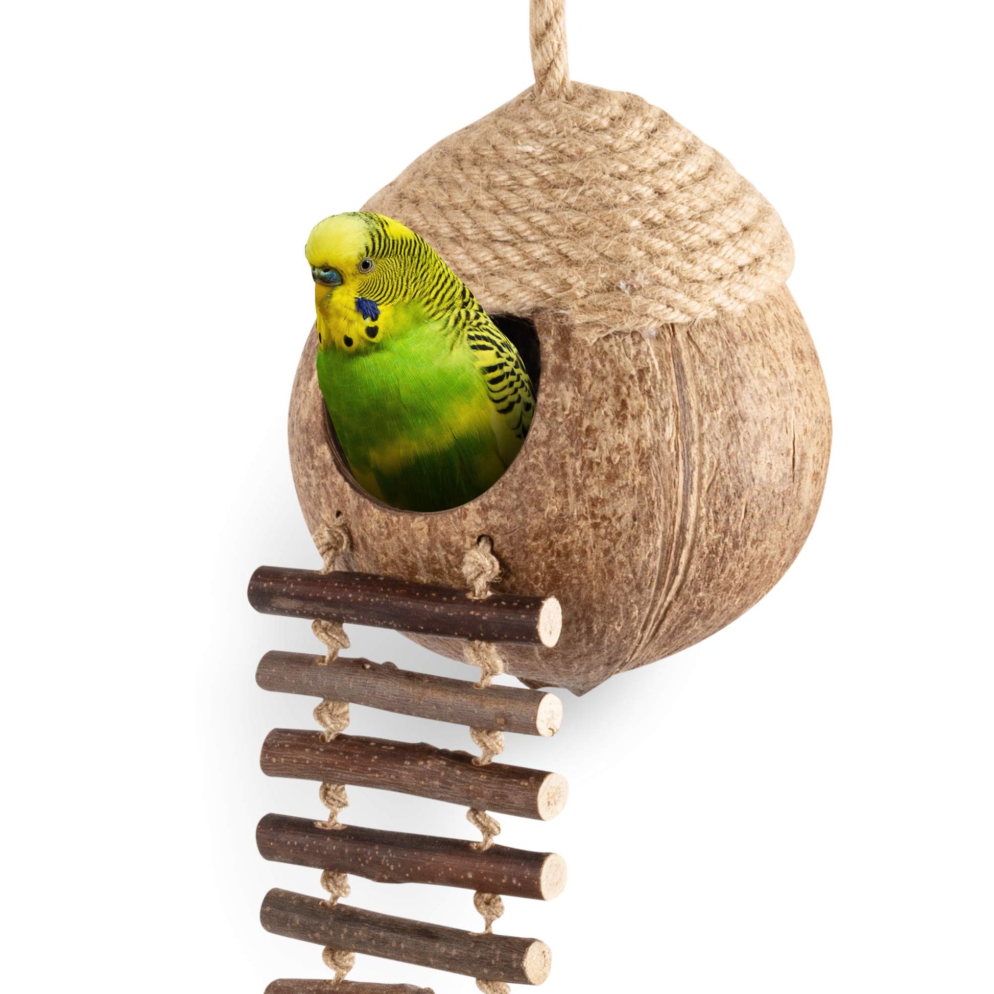 - Natural & Pet Safe Material - Made by natural coconut shell, Apple sticks and rope. Apple twig ladder provides them more for pecking or standing on, also help to keep continuously growing claws worn down to a healthy size